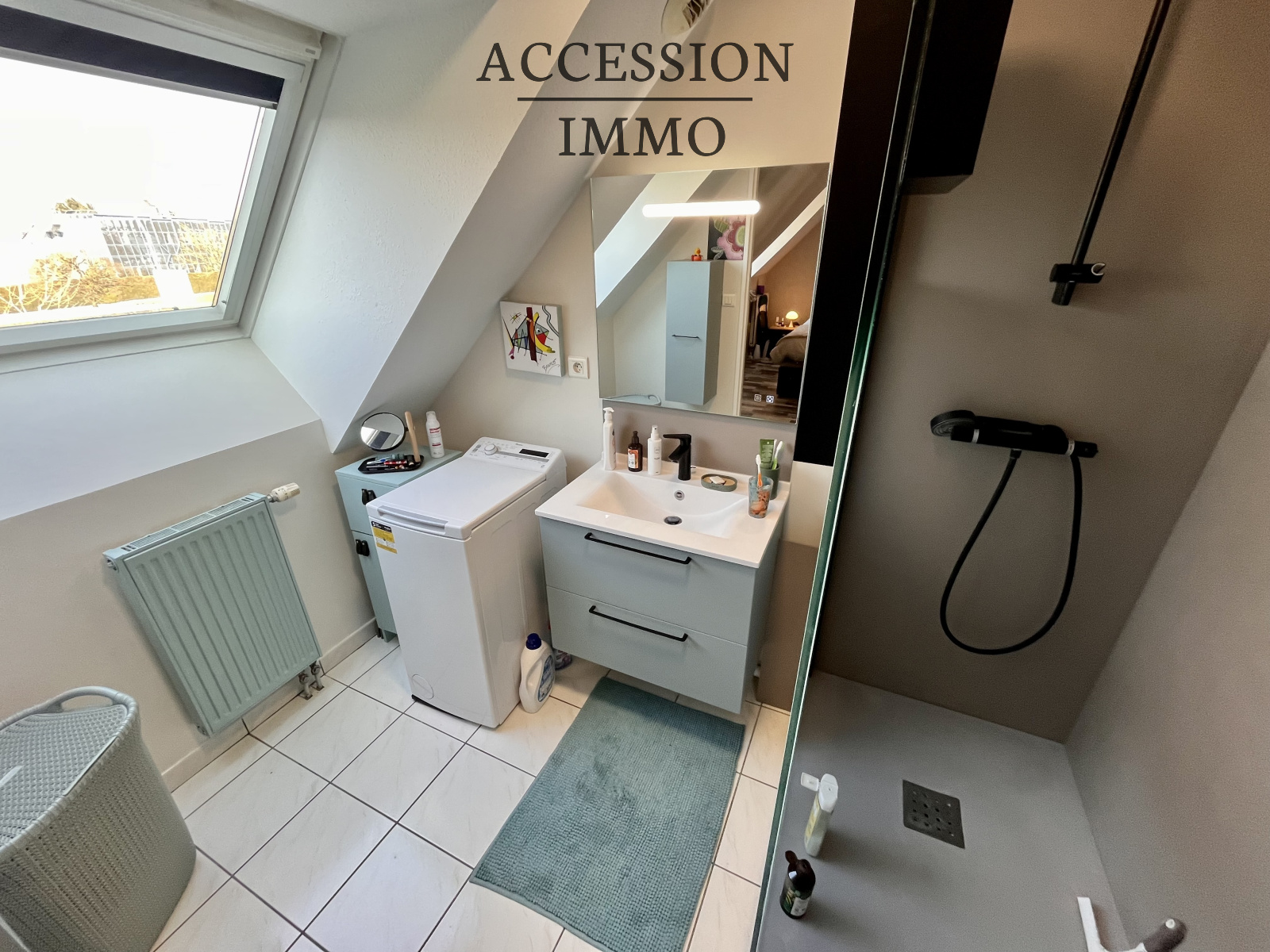 une salle d'eau rénovée carrelée 5 m² (3,55 carrez) grande douche à l'italienne, meuble sous vasque + miroir et meuble, emplacement machine à laver, grand velux oscillant avec store OUEST, une porte coulissante à galandage.