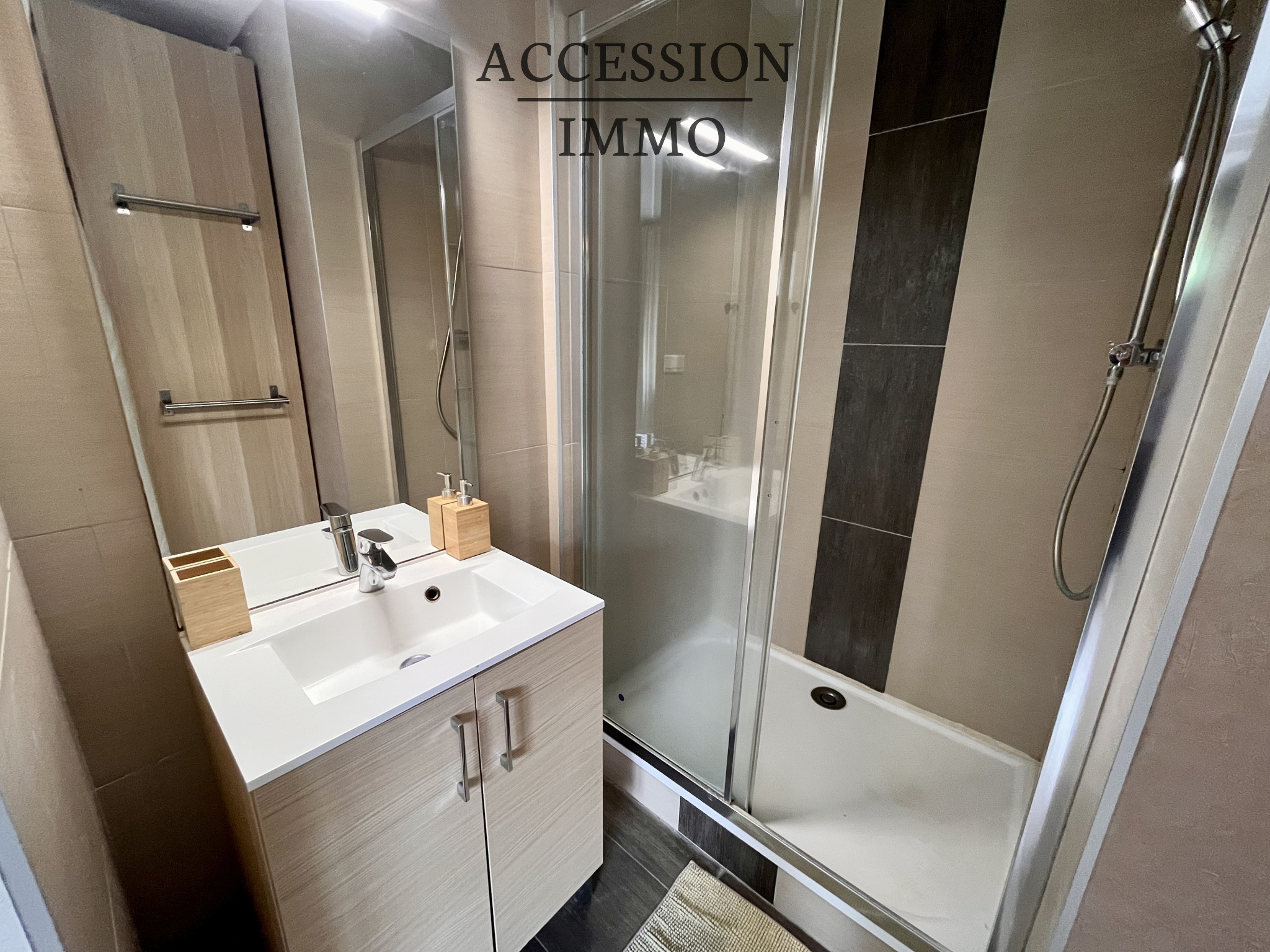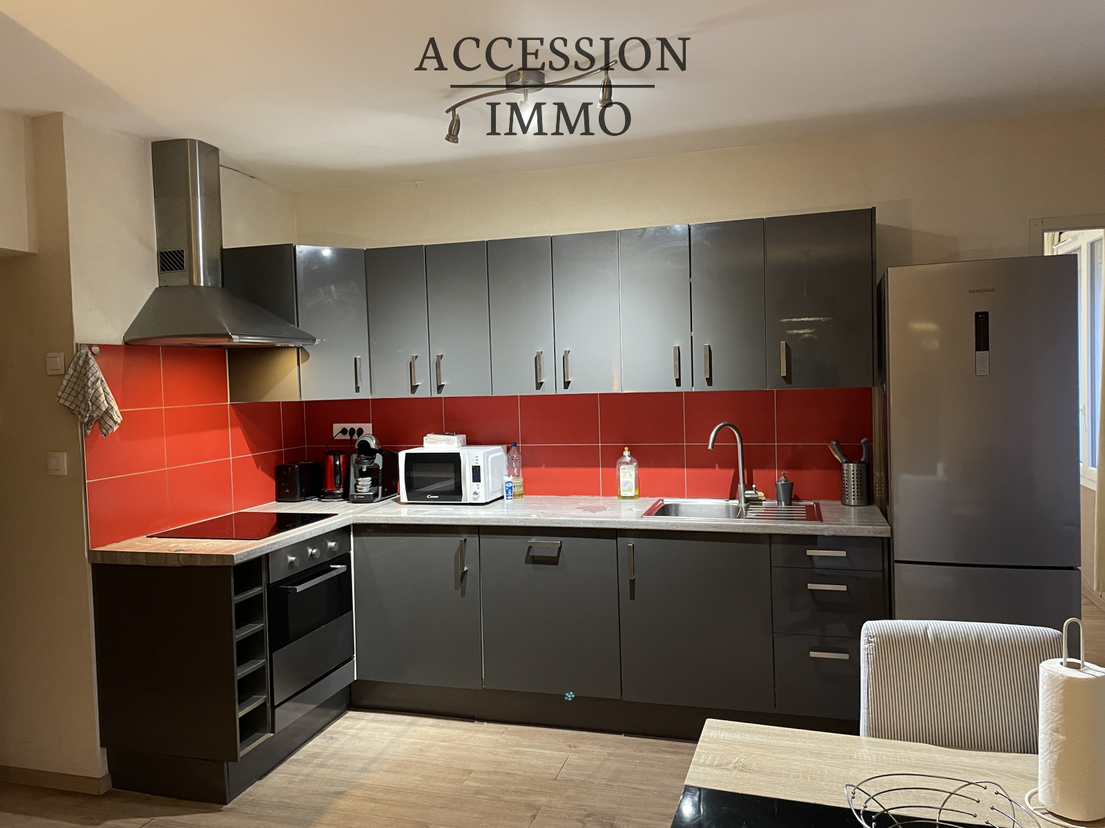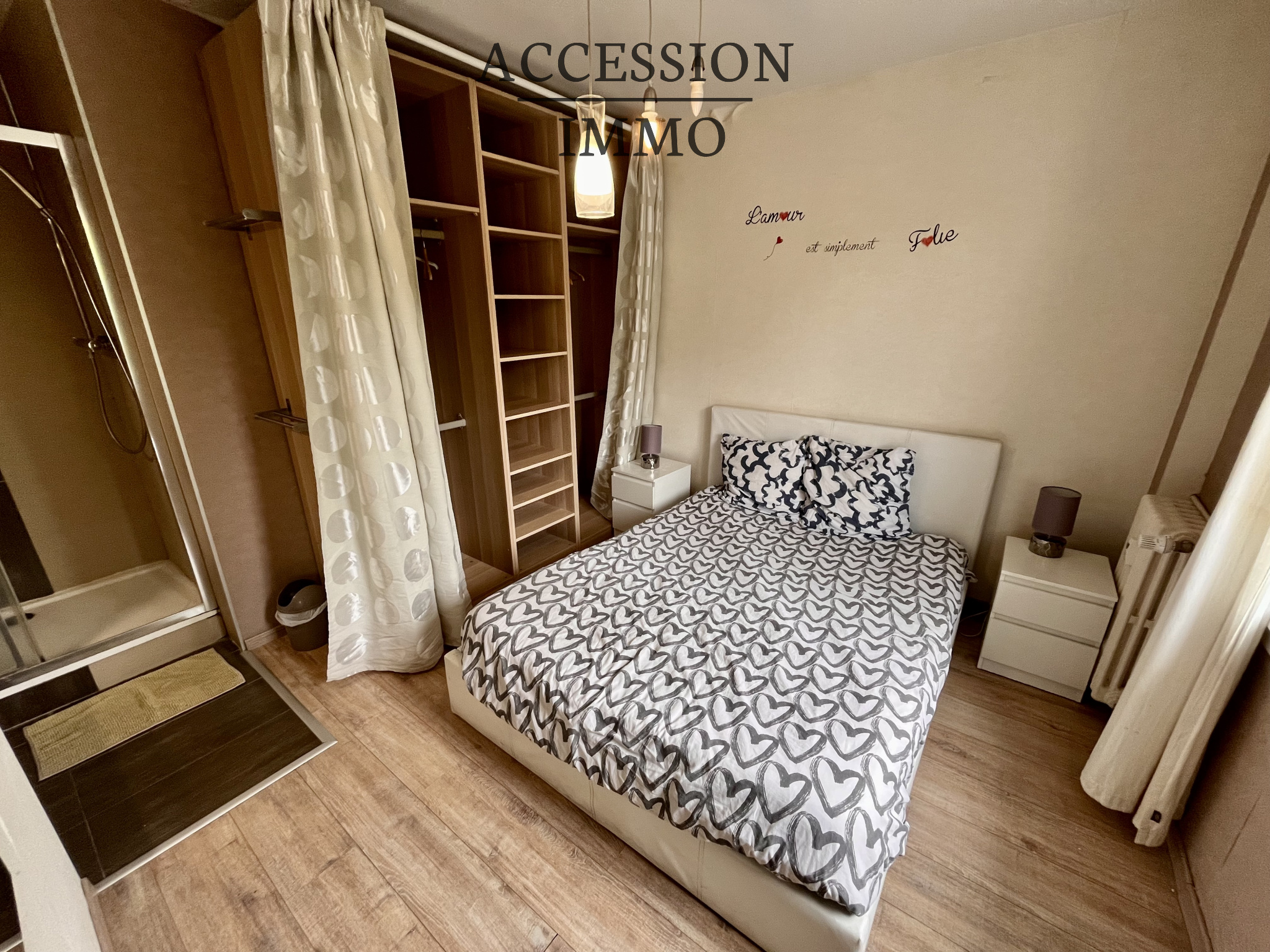 Comprenant : une entrée parquet, un W.C. indépendant, un grand séjour parquet de 24,31 m² avec (buanderie emplacement machine à laver), une cuisine équipée ouverte sur séjour, une chambre parquet 8,95 m² (penderie), une salle d'eau carrelée 3,60 m² (meuble sous vasque) ;